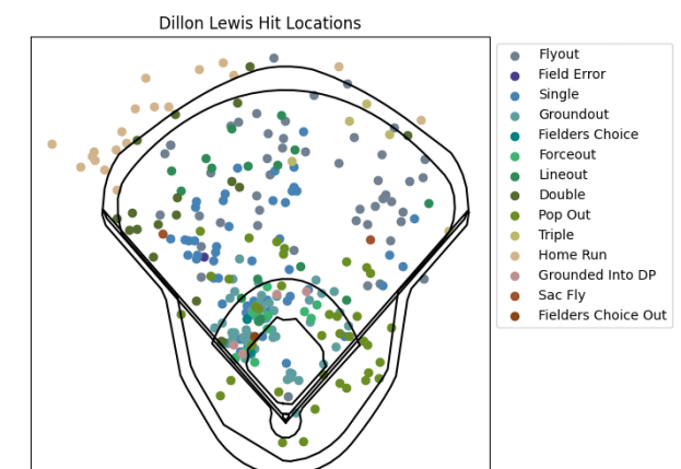 Lewis moves well in the outfield and, for the most part, exudes good jumps off the bat. I don’t know how plus the arm may or may not be, but it isn’t a deficiency. Lewis has logged 10 OFAs on the year. And base stealing seems a part of the package. He probably won’t ever go crazy stealing bags, but it’s a feature of his game.
