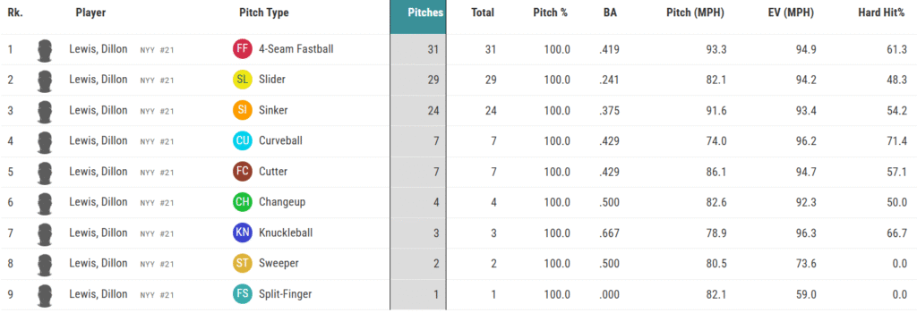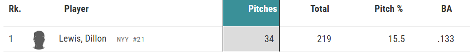 Lewis looks like a hit it out in front approach, which makes a lot of sense for him. Opposite field hits feel more like being late than an approach. You saw a lot of GB singles in our sample. The GB rate is fine over his season, but when you throw in his ability to run and hit those ground balls as hard as he does, that rate scoots over to feature: