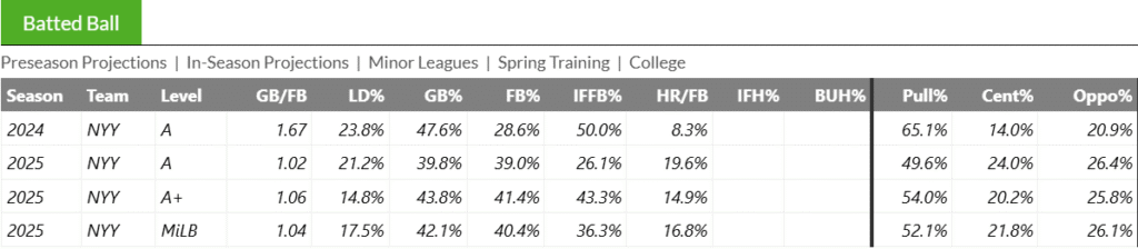 Something you don’t get a sense of there is his ball/strike recognition. Over his 2025 Tampa run, he swung at 15.5% of pitches in the Savant sample’s chase/waste zones: