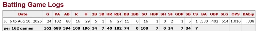B‑siding season starts to get juicy this time of year. Lewis feels like a muddy winner. I think we’re hard pressed to find as enticing a 5‑tool play at 1% as Lewis right now. A potential play for all league types. 114 mph HRs, gunning runners out at home, covering a lot of CF turf, swiping bags, walking a decent 9%, striking out 23%, breaking up no-hitters, making good on the booths’ called shots, and potentially coming into his own. Lots to like. In some ways, this feels like the 2025 version of the 2024 Bo Davidson dynasty play. Not similar in player, but similar in lack of popularity paired with a skill set worthy of a play. If you’ve got some DSL box score hopeful, why not expedite the whole thing and nab Lewis?? Perhaps a bit of technician gets coached into him?? Nothing wrong with good, getting better.