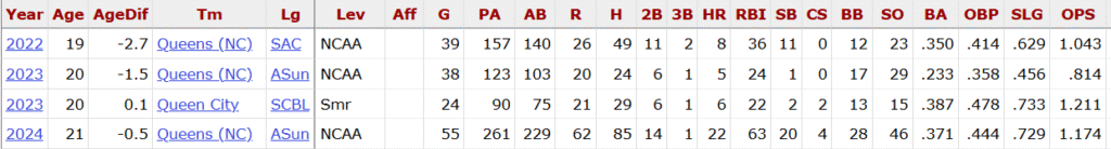 The Yankees’ used their 2024 13th-round slot on a young mid-major (?) college bat from Queens (NC). Lewis, an unheralded prep, had himself a 55-game, 20/20 send-off season with Queens: