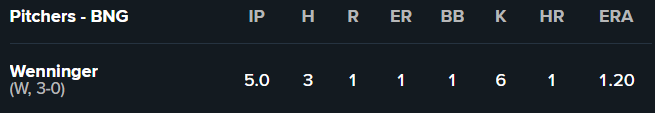 Wenninger threw 46 of his 76 pitches for strikes (61%), with his fair share of non-competitive pitches, of which all his offerings were guilty. Keeping it real though, this outing’s zone was tiny at times, and he got robbed of too many strikes. Regardless, Wenninger is more of a strike thrower than an execution guy. His game on the edges is not MLB quality at this juncture, and far too many of his strikes are earned over the heart of the plate. His locations are not great. The split-changeup is his best pitch. When he buries it out of the zone, it looks nasty and gives this lineup fits. But he did miss up with it more than you want to see. This was the case when he gave up this homerun to Luis Verdugo: