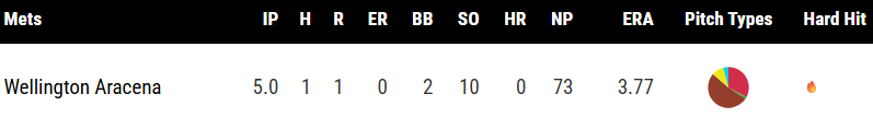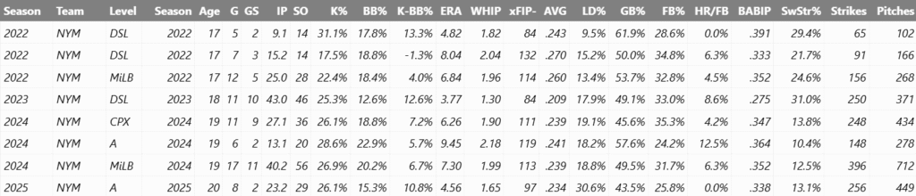 Aracena’s introduction to A ball at the end of last season caught my eye enough to throw him out as my Mets’ B‑Side choice for 2025. At the time, a teenager touching 100 mph with the micro-sized archive sample showing something other than an arm with the ballooned walk rates he put up previously. Last night was Aracena’s best showing as a pro, marking the deepest he’d gone into a game, the most pitches thrown, the highest strike% of 2025, and a career high 10 strikeouts. I imagine he’d not struck out 8 batters in a row before either. Here’s his work as a pro and said outing: