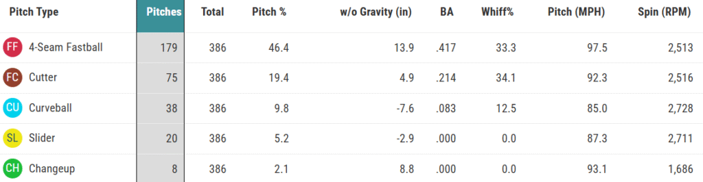 Aracena’s arsenal can blend to the point Savant has a hard time. The one changeup said to be thrown was not a changeup, although I did spy a try at something looking splitter-esque (50 sec mark) that got marked an 88 mph cutter, which is off. Looking at his Savant sample, he may be trying to develop an off-speed pitch, but we digress.